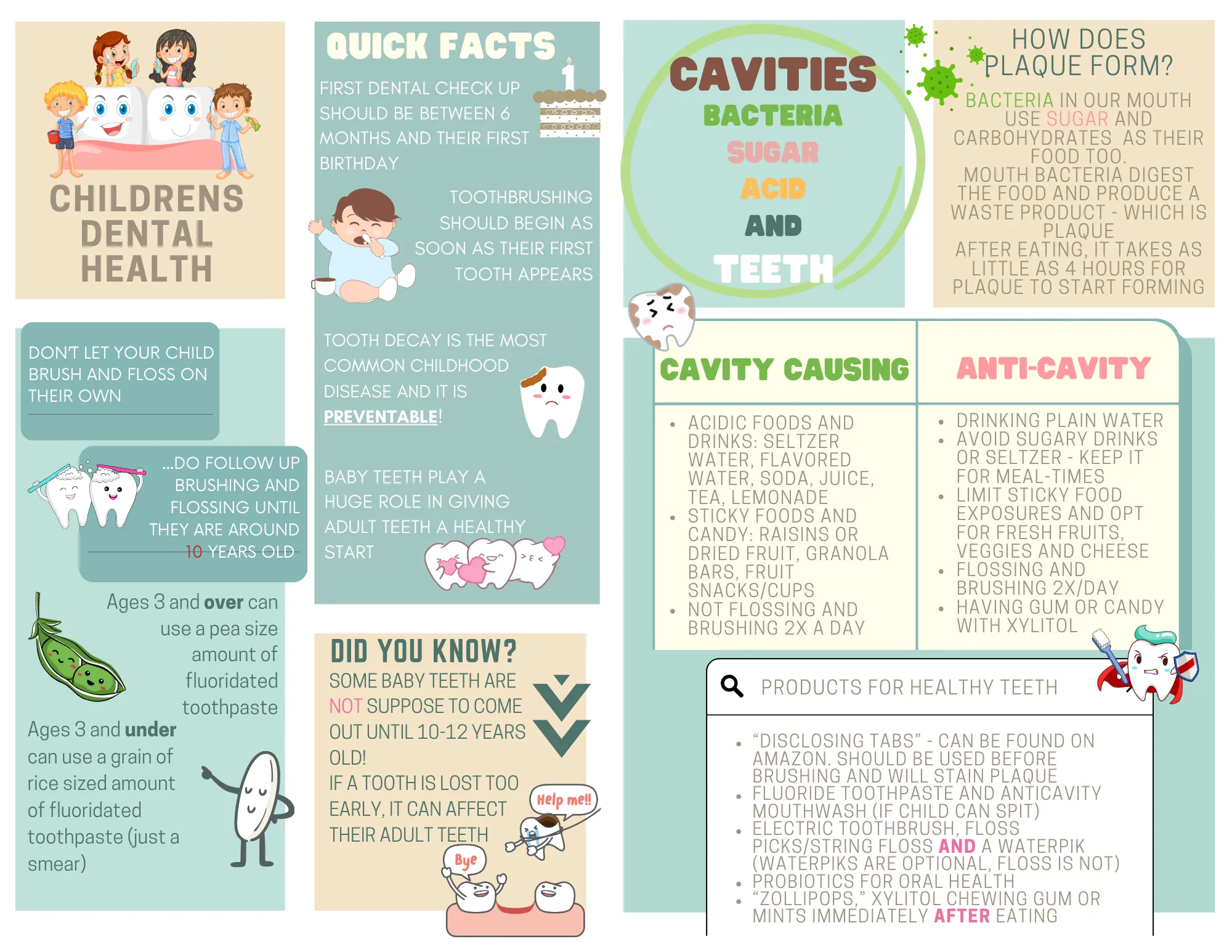 We love visiting classrooms (especially during DENTAL HEALTH AWARENESS MONTH IN FEBRUARY!) to help kids get excited about visiting the dentist and making dental care fun! We also value parent education on diet, homecare, and dental care. Along with this fun-fact handout for the kids to bring home, we send in dental toys for a sensory bin activity, tooth related age appropriate books, and tooth science or math activities. You can always message or call us for more info and we can send you a printable link to this pamphlet for free!